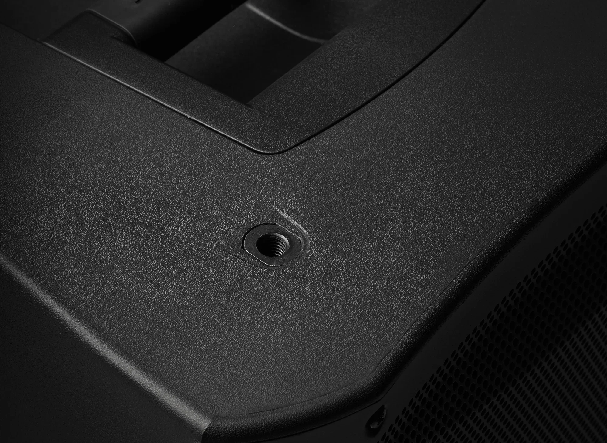 Rugged, portable enclosure with ergonomic handles and multiple mounting options: flown, pole-mounted, ground-stacked, or floor wedge