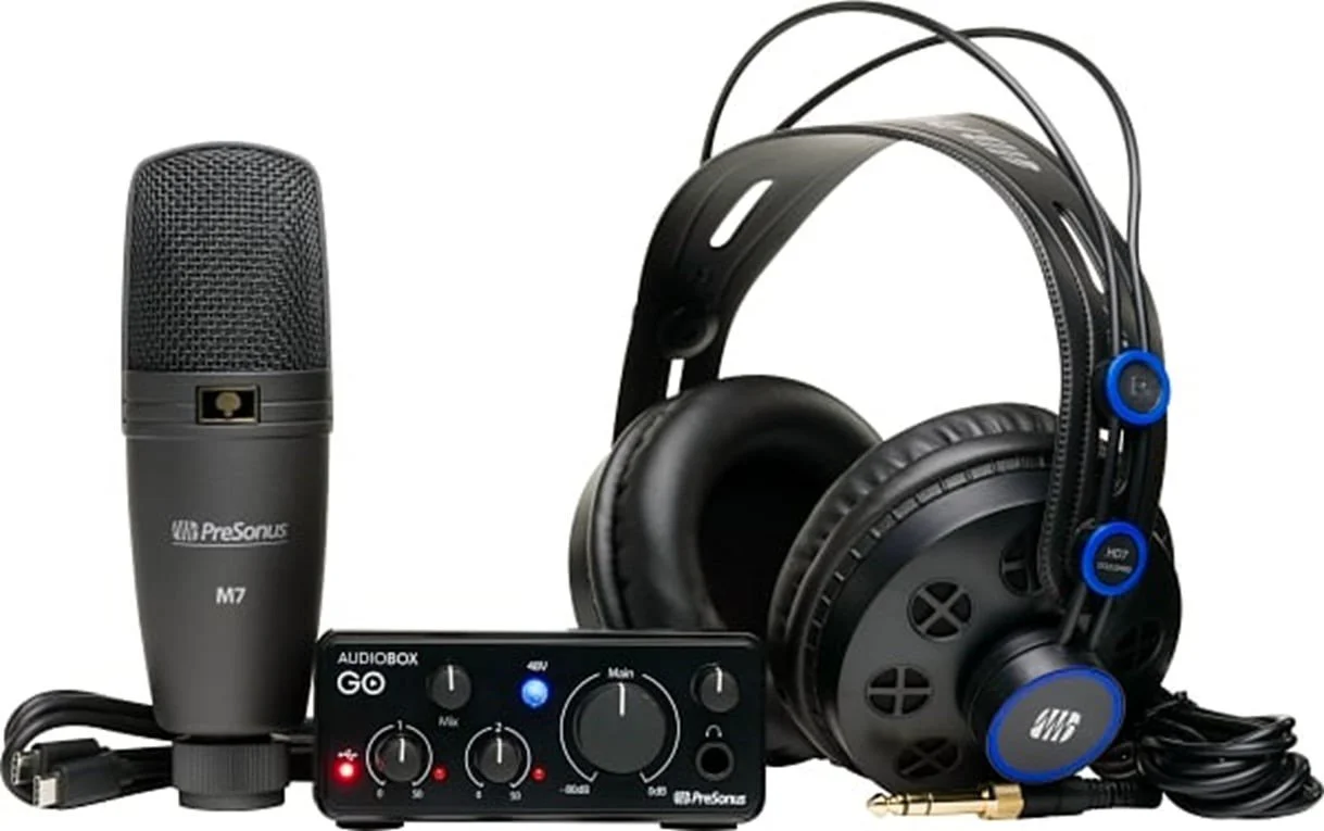 Our complete recording package with USB-C audio interface, high-definition headphones, and cardioid condenser microphone for aspiring creators.