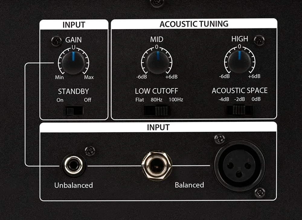 Audio Switches - Acoustic Space (Flat, -2 dB, -4 dB)Low Cut (Flat, 80 Hz, 100 Hz @ -12 dB / octave)
