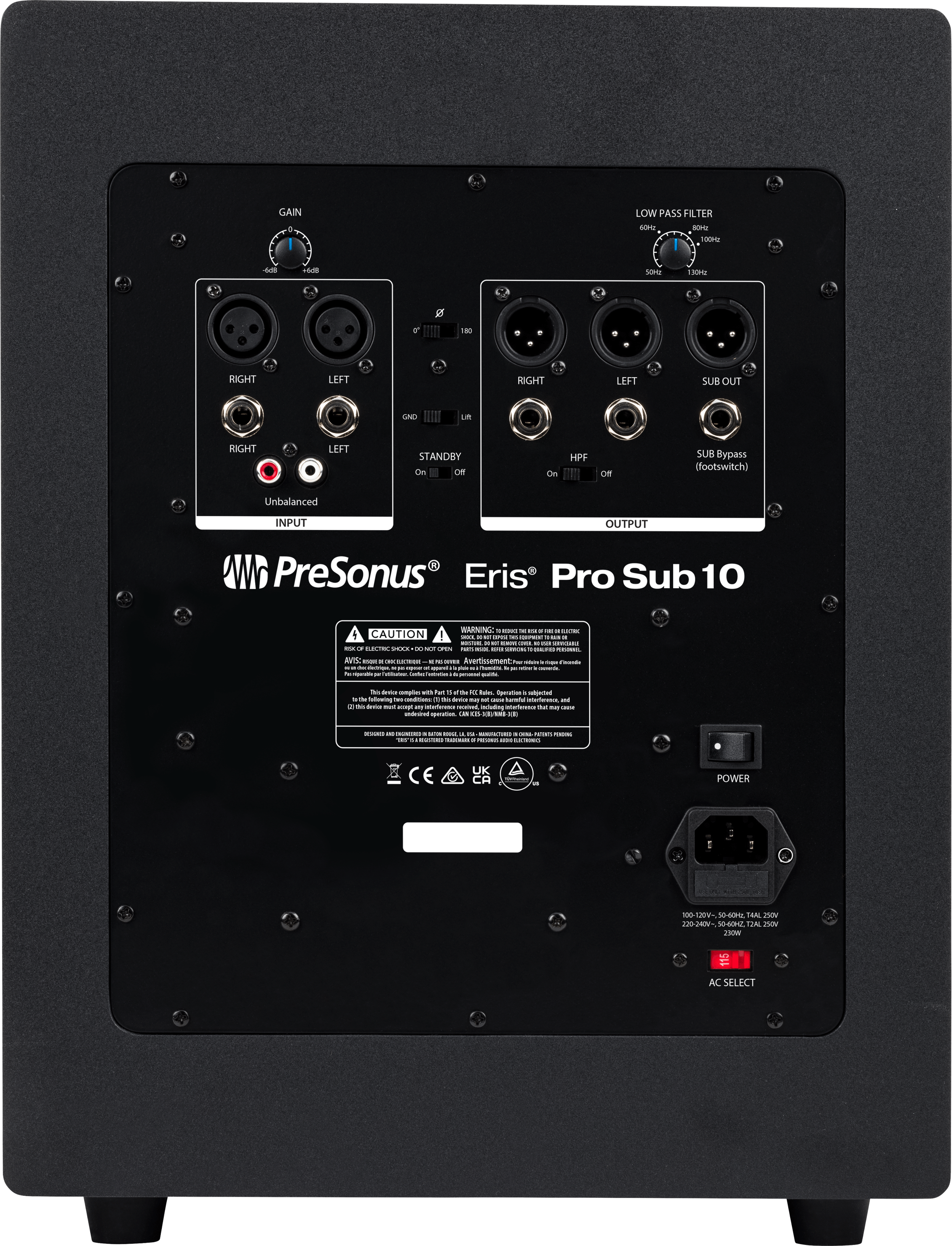 Powerful and musical, the PreSonus® Eris Pro Sub 10 active, front-firing studio subwoofer is designed to deliver fast and accurate transient response, extending low frequencies down to 20 Hz, allowing you to hear the full-spectrum range of your mix. Driven by 170W (RMS) Class AB amplification, the Eris Pro Sub 10's 10-inch, glass-composite, low-frequency driver delivers tight, responsive sub-bass, thanks to its lightweight and rigid cone. This design provides lower distortion than other materials for sub-bass reproduction that's as coherent and clear as your full-range monitors.