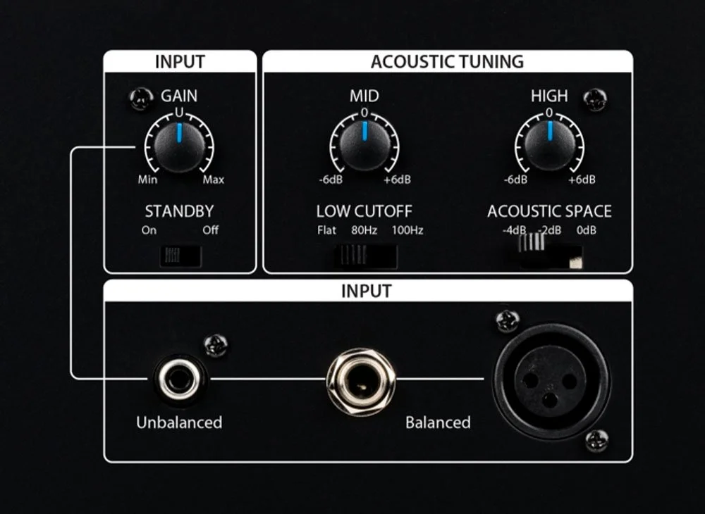 Acoustic Tuning controls: HF (±6 dB, continuously variable); Midrange (±6 dB, continuously variable), and Acoustic Space (flat, -2, -4 dB), plus highpass filter (Off, 80 Hz, 100 Hz)