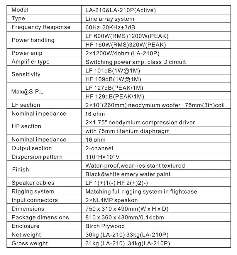 LA-210P is a compact module for line array system. two 10"neodymium woofers, two 1.75"neodymium compression drivers and high-performance low-distortion compression driver with innovative horn design of wave phase philosophy. The driver is coupled with an acrylic wave adaptor, which allows an even wave performance. The dual phase adaptors design is another unique technology, which leads to high flux density and to enhancement of sound pressure.