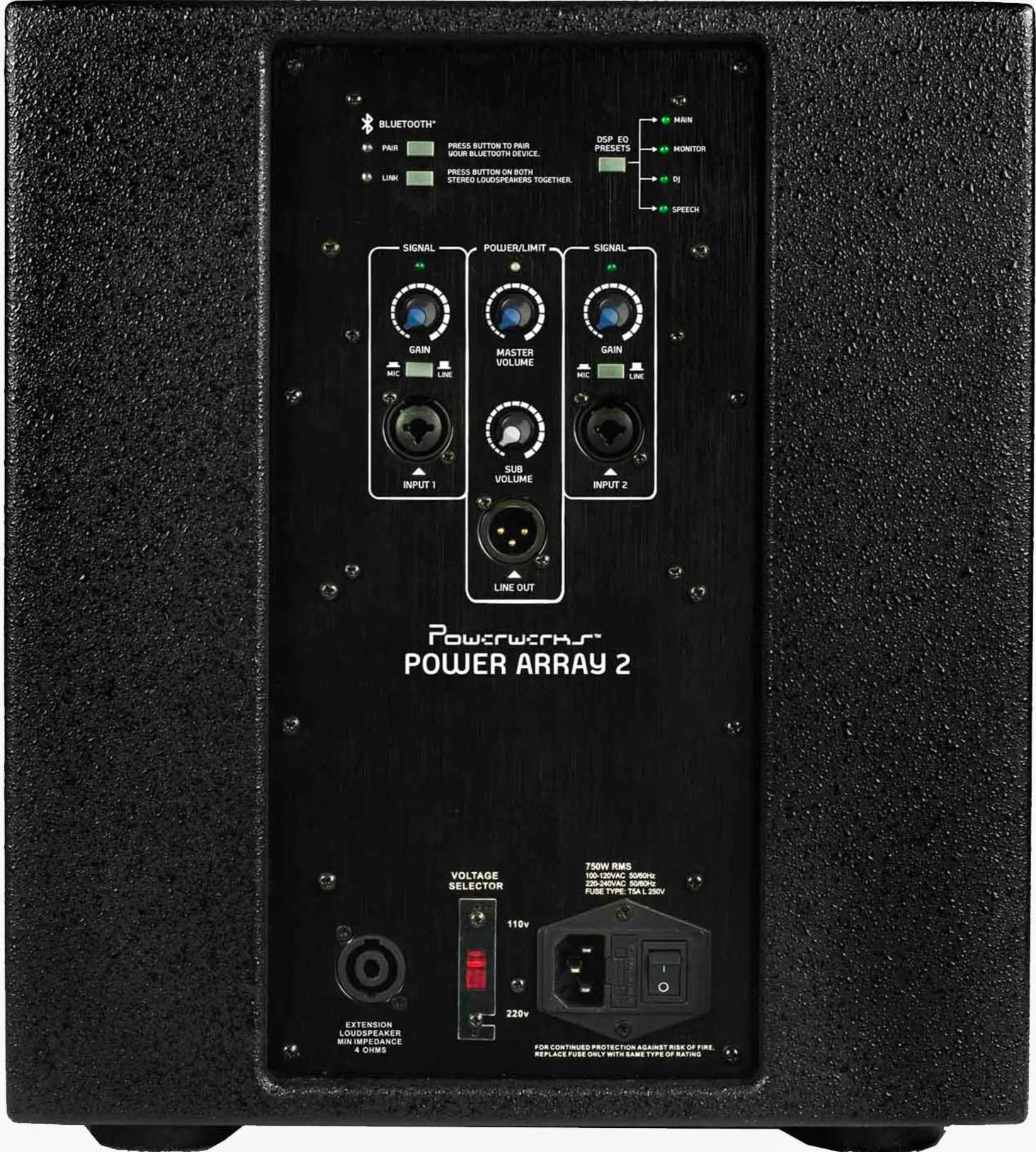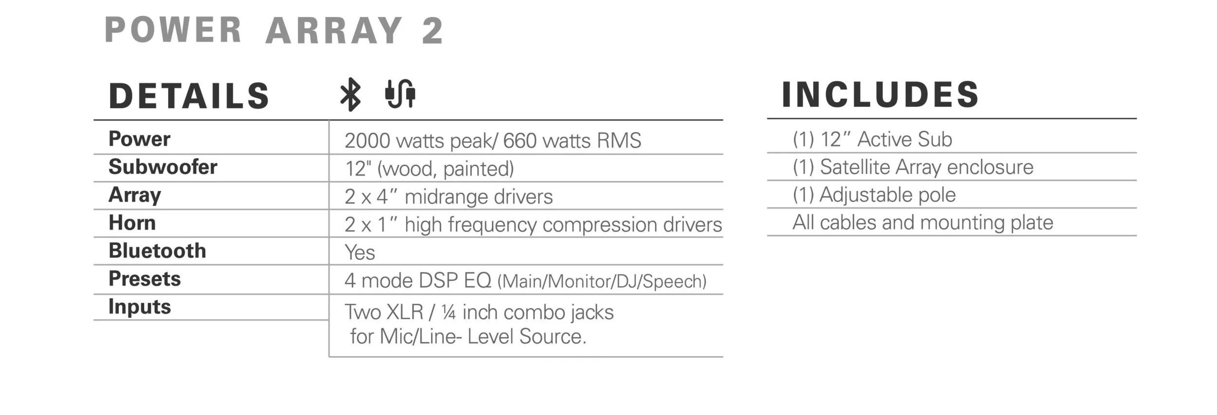 The Powerwerks Power Array 2 features four modes of onboard DSP EQ presets, an adjustable subwoofer volume for control of your overall output mix and an XLR thru which allows performers to enhance and expand their sound by connecting to other powered systems. You can also connect with another Powerwerks Power Array 2 system (Bluetooth only) for even more expandability and true stereo capabilities.