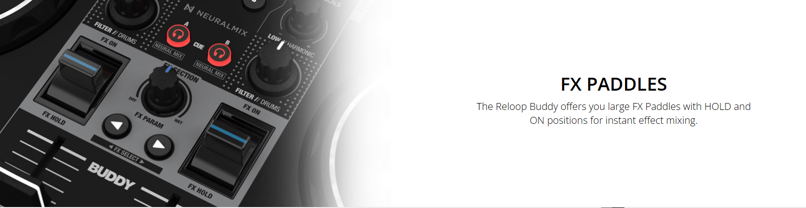 "Another great feature on the Reloop Buddy is it´s convenient effect-paddles with holding on positions, they are super fun to play with. They defenetly offer you an easy solution for adding in effects to your mix.“