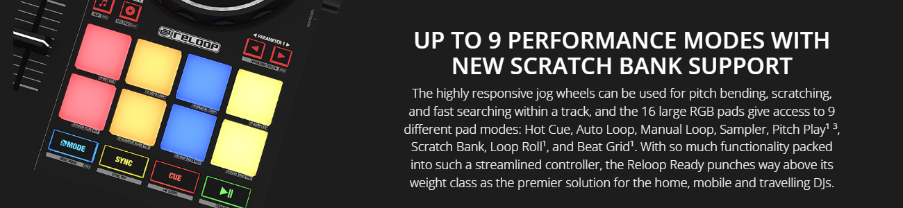 9 performance modes: hot cue, auto loop, manual loop, sampler, pitch play¹ ³, loop roll¹, beat grid control¹, user mode¹ and scratch bank mode