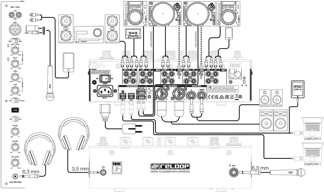 The RMX-95 also excels in terms of connectivity: Four CD, two line, and two phono inputs are available on the four input channels. The separate microphone channel has two microphone connections (1 x jack, 1 x jack/XLR combination jack) and an additional AUX input. The master output offers RCA or balanced XLR cable connections. The booth output has two jack connections for stereo operation. However, it can also be used in mono mode. A recording device can be connected to the Rec output via RCA jacks to record DJ sets – regardless of the master output level. Last but not least, the DJ mixer has two jacks for headphones.