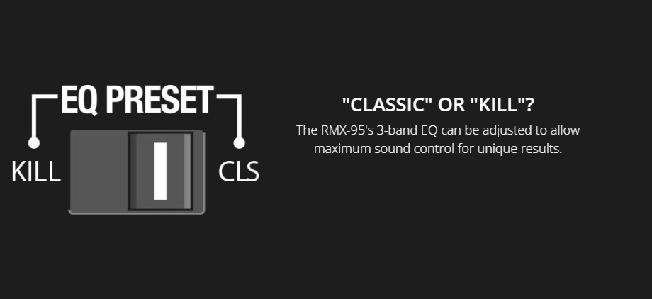 EQ range isolator at 70 Hz, 1 kHz, 13 kHz: -90 dB (total kill)/+9 dB