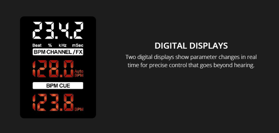 New Beat FX unit with multiple effects in studio quality: Echo, Reverb, Flanger, Phaser, Vinyl Brake, Loop Roll, Noise, Pitch Shift, Delay, Ping Pong Delay, Tape Delay, Bit Crusher,Transformer