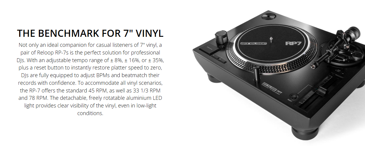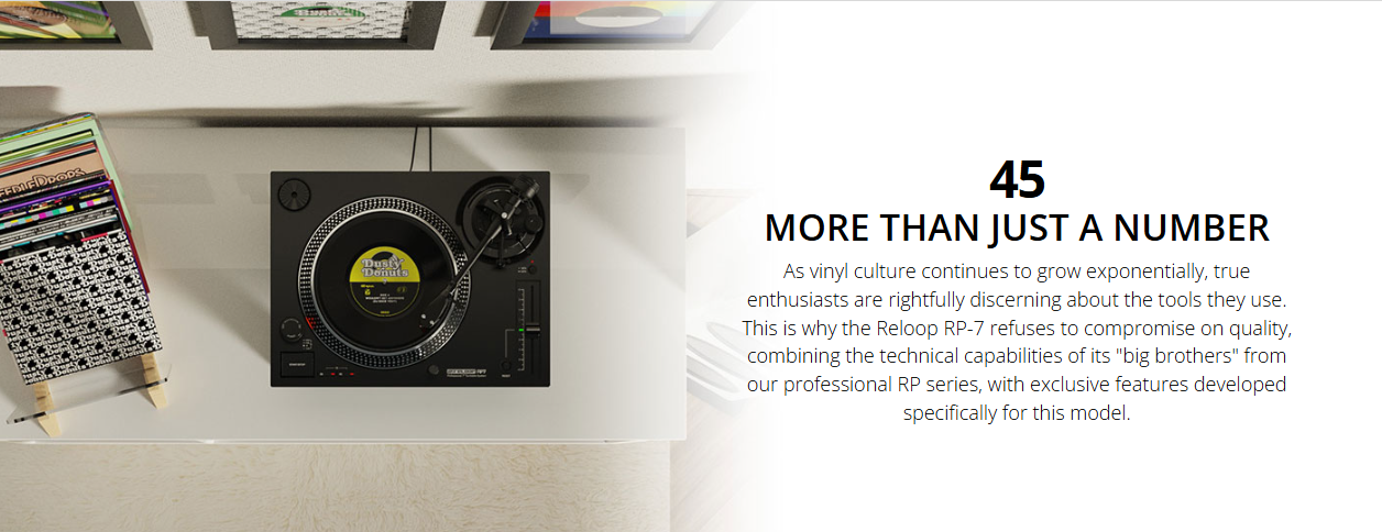 As a tribute to 45s culture, the Reloop RP-7 captures the unique appeal of this beloved format and honours those who regard 7" vinyl as more than just a music medium. As the first-ever professionally mass-produced DJ turntable for 7" vinyl, the RP-7 breaks new ground for this passionate community to express themselves and inspire new generations.
