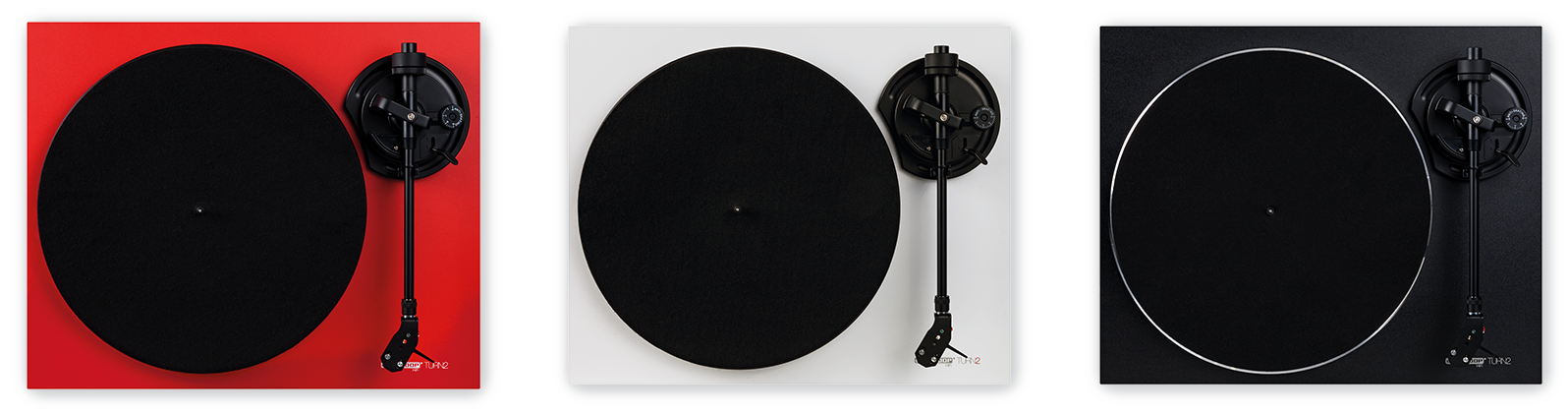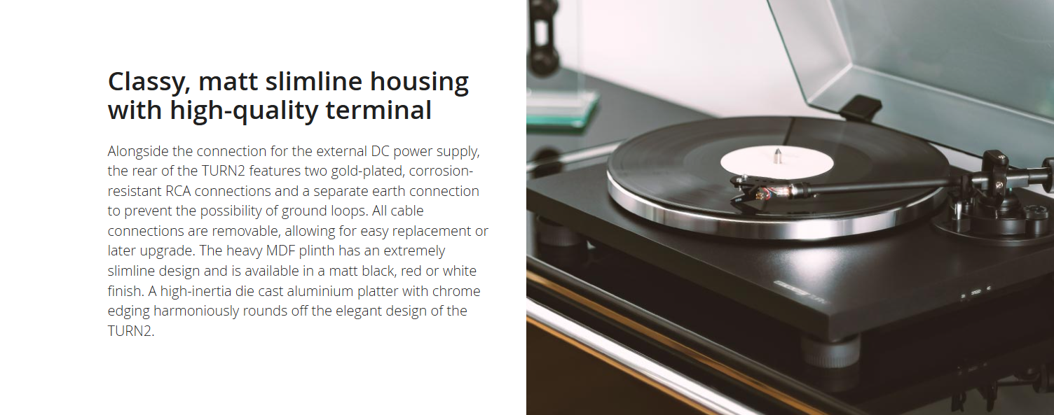 Alongside the connection for the external DC power supply, the rear of the TURN 2 features two gold-plated, corrosion-resistant RCA connections and a separate earth connection to prevent the possibility of ground loops. All cable connections are removable, allowing for easy replacement or later upgrade. The heavy MDF plinth has an extremely slimline design and is available in a matt black, red or white finish. A high-inertia die cast aluminium platter with chrome edging harmoniously rounds off the elegant design of the TURN 2.