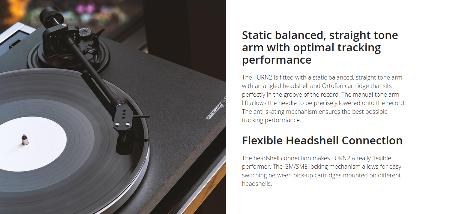 The TURN 2 is fitted with a static balanced, straight tone arm, with an angled headshell and Ortofon cartridge that sits perfectly in the groove of the record. The manual tone arm lift allows the needle to be precisely lowered onto the record. The anti-skating mechanism ensures the best possible tracking performance.