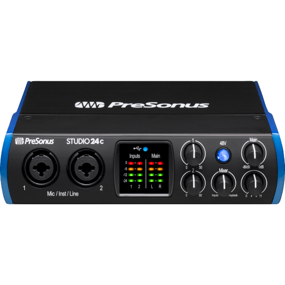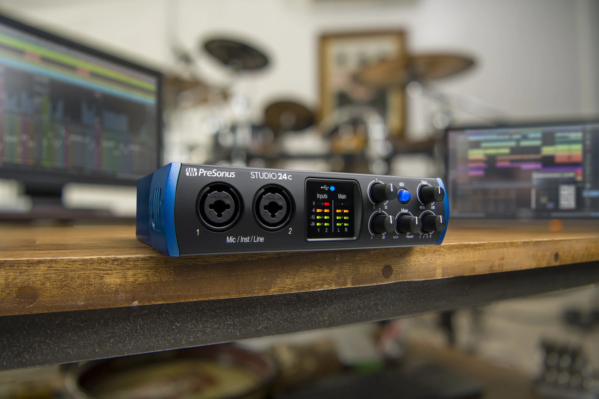 Whether you're just getting into recording or are a veteran producer who wants to go mobile, the Studio 24c will give you clear, clean, ultra-high-def sound in a bus-powered, rugged unit. A complete home recording studio right out of the box, the Studio 24c audio interface comes with a complimentary license for PreSonus' award-winning Studio One® Artist music production software so you can start recording right away.