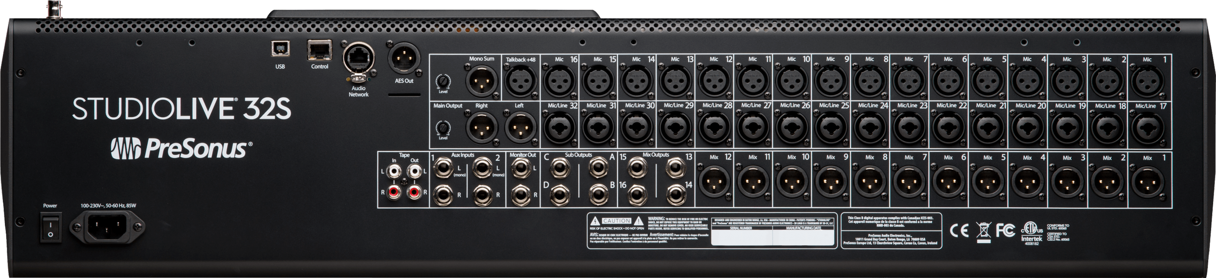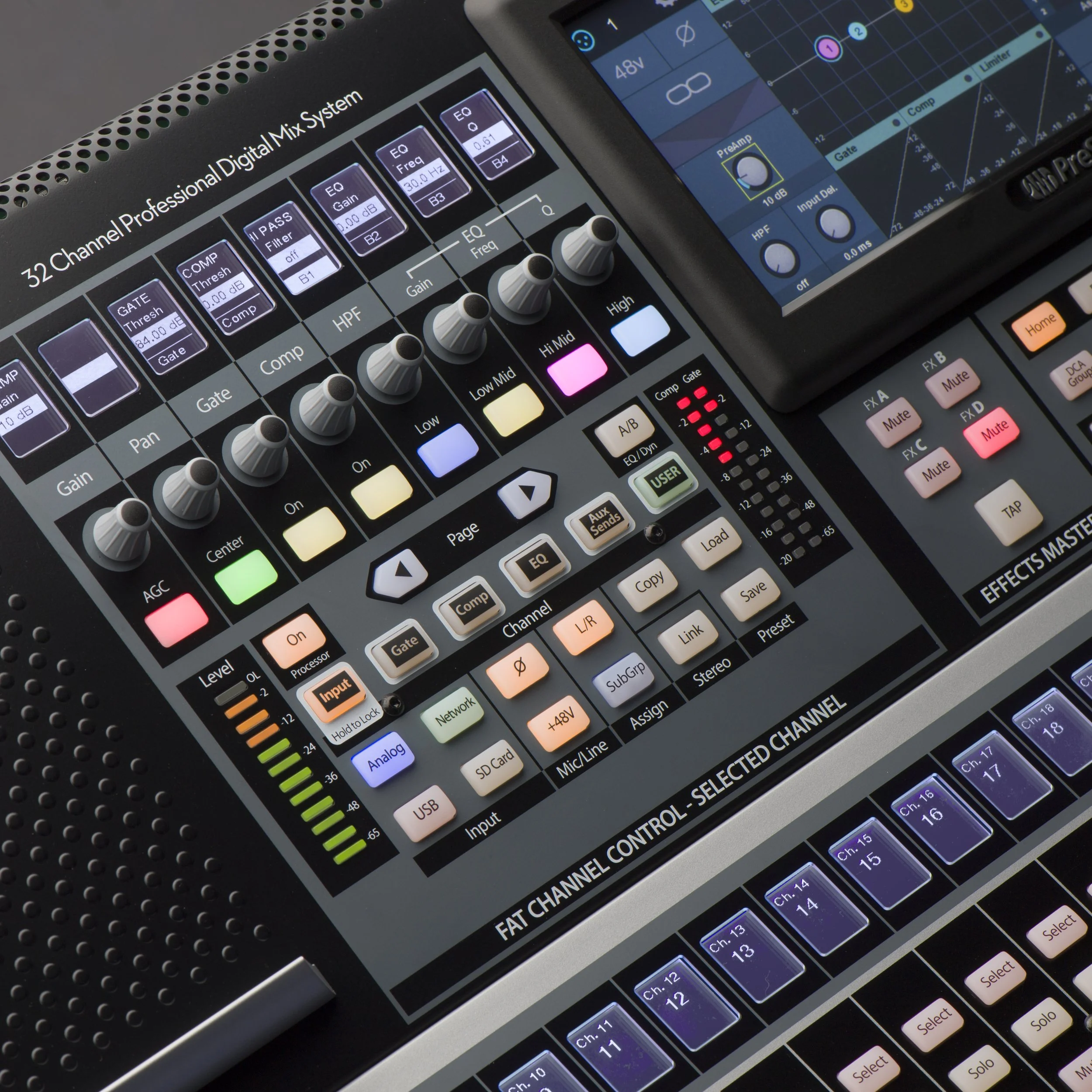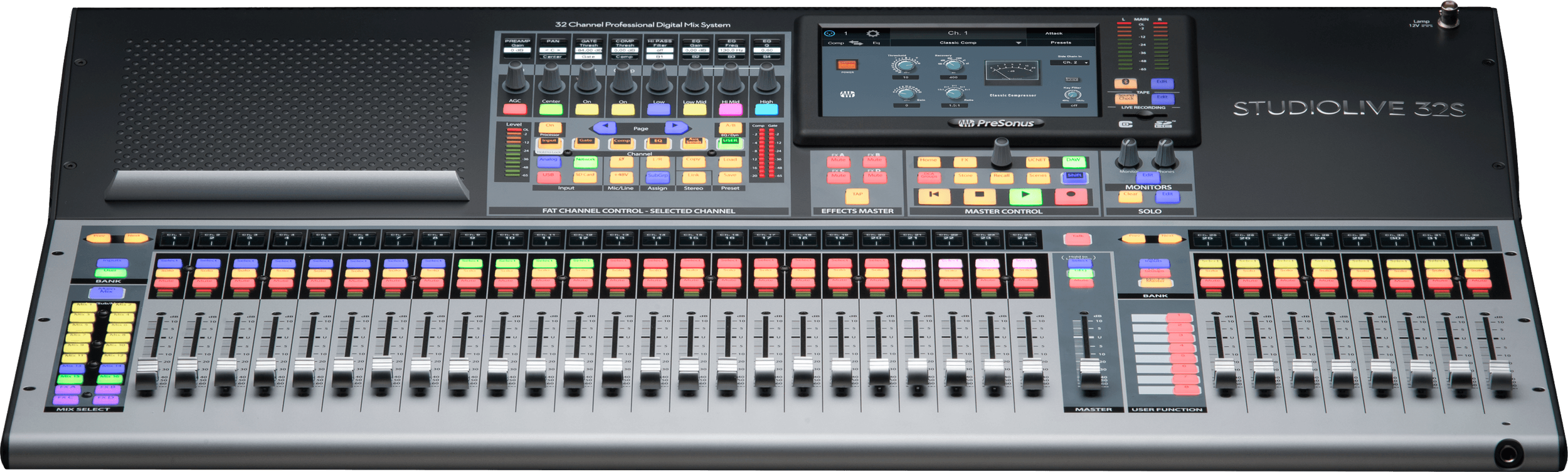 A 32-channel powerhouse with one-to-one channel control the StudioLive 32S is a small-format digital mixer with large-format mixing power. Thanks to AVB, it's easily expandable - readily networking with EarMix 16M personal monitor mixers for customized onstage mixes and PreSonus NSB-series stage boxes for remote inputs. The StudioLive 32S's 16 FlexMixes can be individually configured to function as aux buses, subgroups, or matrix mixes allowing you to customize your mixer any way you wish. The Fat Channel processing section employs expandable plug-in options with vintage EQ and classic compression options on every input channel and output bus.