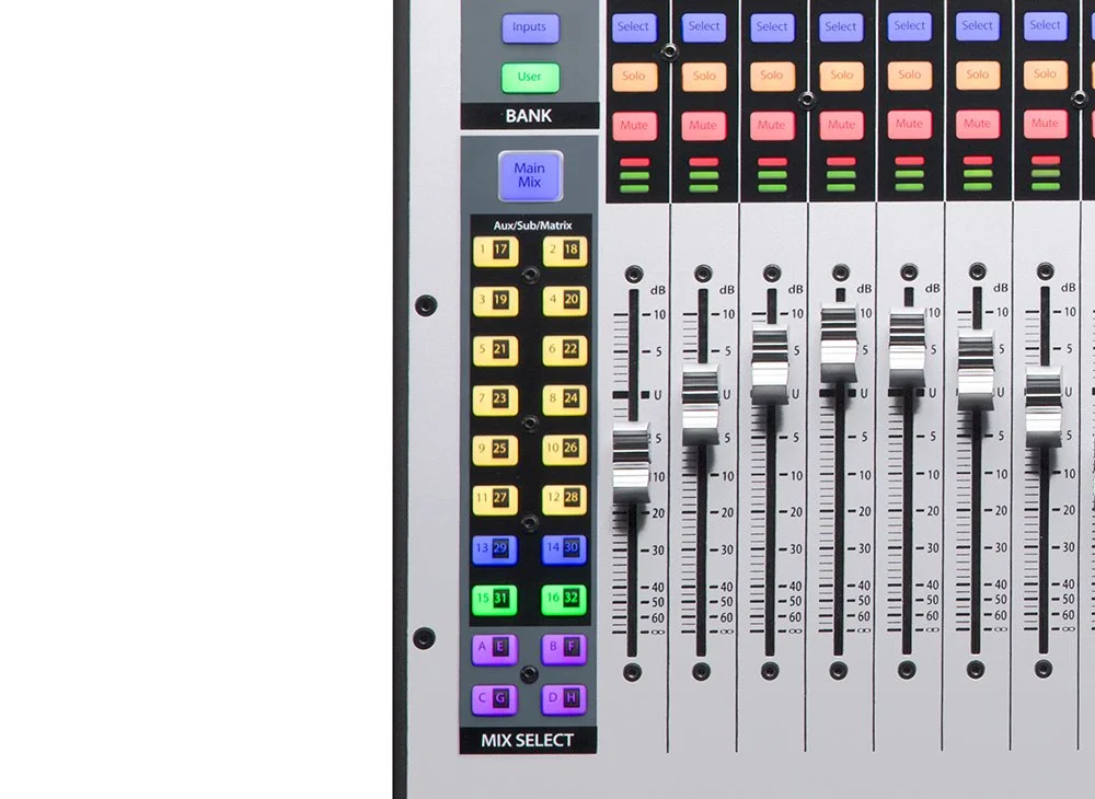 24 Mix buses: 16 FlexMixes (Aux-, Matrix-, or Subgroup- configurable), 4 FX Mixes, 4 Subgroups