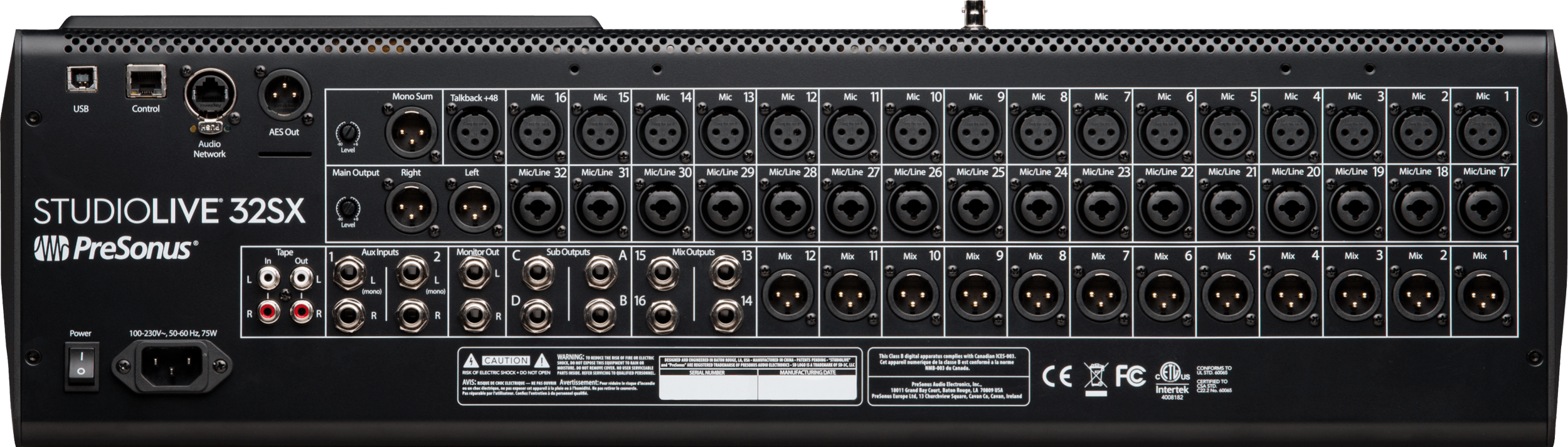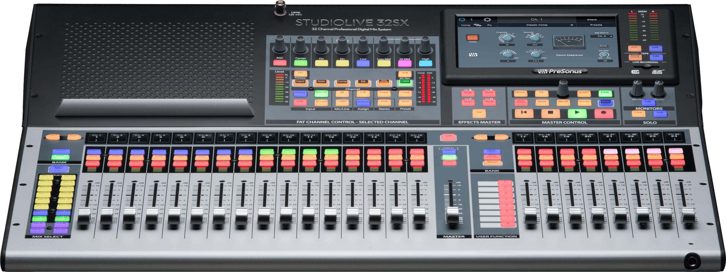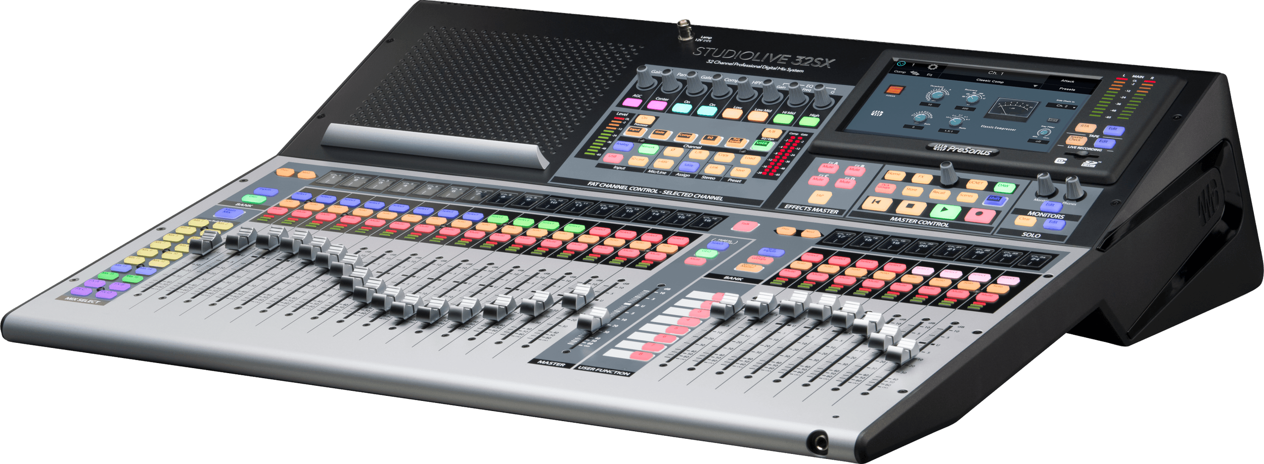 The StudioLive 32SX is a 32-channel small-format digital mixer packed into a 25-fader chassis. The split-fader workflow options let you manage 32 input channels in two fader layers, while still providing access to your mix outputs on eight additional faders. Thanks to AVB, it's easily expandable - readily networking with EarMix 16M personal monitor mixers for customized onstage mixes and PreSonus NSB-series stage boxes for remote inputs. The StudioLive 32SX's 16 FlexMixes can be individually configured to function as aux buses, subgroups, or matrix mixes - your routing options will border on limitless. The Fat Channel processing section employs expandable, plug-in options with vintage EQ and classic compression options on every input channel and output bus.