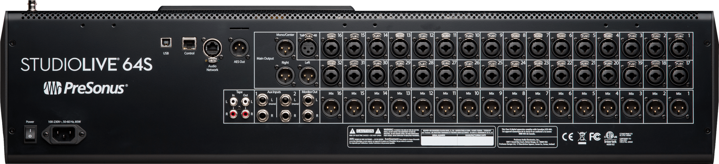 With the 76-channel StudioLive® 64S and a full suite of integrated software, PreSonus® delivers the most powerful and flexible digital console available for installed sound, touring, and recording - and the best value. Powered by the PreSonus quad-core FLEX DSP Engine, no other mixer can match its 128-channel (64x64) USB recording, 76 mixing channels, 43 buses, and an astounding 526 processors. Features such as password-protected user profiles for restricting feature access and mixer scenes organized by project, make the StudioLive 64S ideal for installed sound. Thanks to built-in AVB networking, the StudioLive 64S integrates with stage boxes, personal monitor mixers, switches, and more. Managing 76 total inputs is easy with 32 FlexMixes and 24 DCA groups. The Fat Channel processing section offers expandable plug-ins with vintage-style EQ and compression options on every channel and output bus.