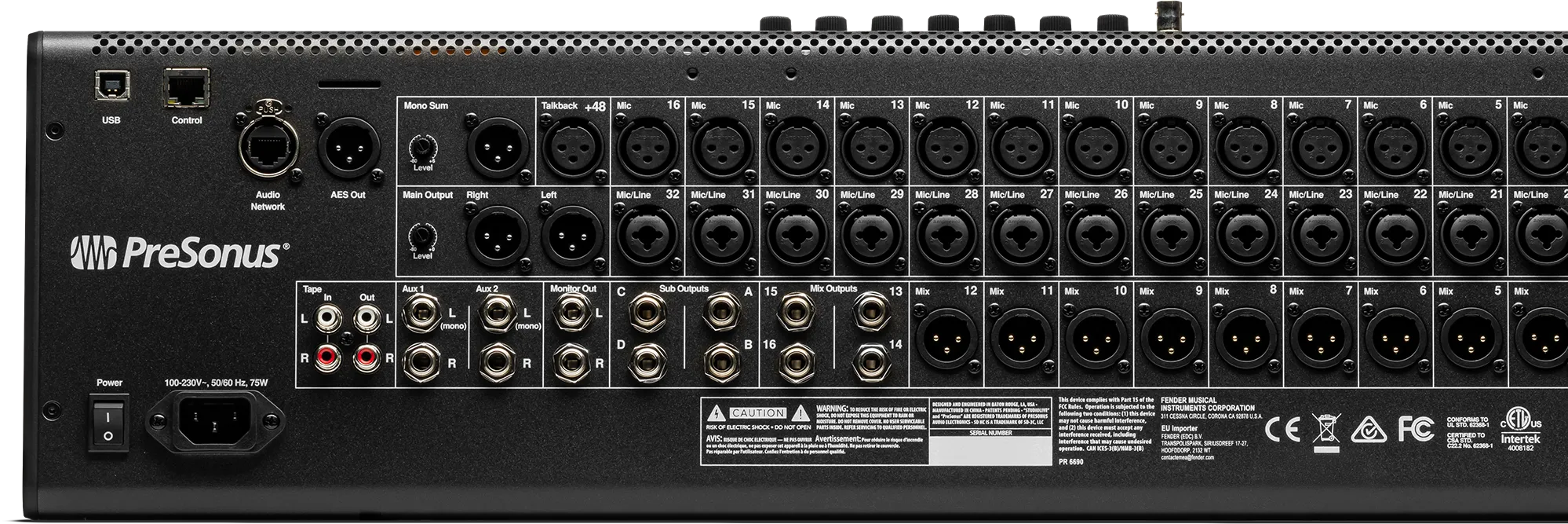 16 (via combo) line inputs plus 2 pairs of balanced stereo ¼” Aux Inputs