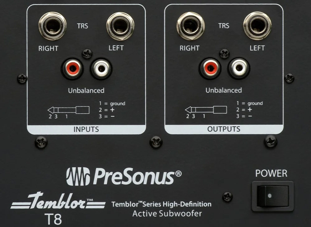 The Temblor® T8 offers versatile connectivity, including left and right balanced XLR and ¼” TRS and unbalanced RCA main inputs. Connect your full-range monitors with left and right balanced XLR or ¼” TRS outputs; a switchable highpass filter removes frequencies below 80 Hz.